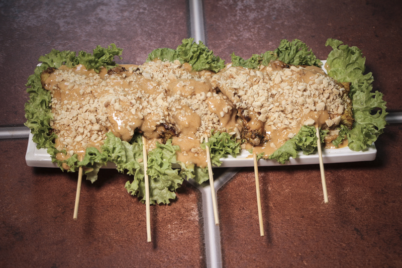 Aún no terminaba mis brochetas cuando se presentó el Sate-Gai: brochetas de pollo marinadas en hierbas tailandesas, cubiertas de salsa de maní con curry massaman y leche de coco. Un plato para vivir en él. Un gran momento donde los sonidos desaparecen y quedas sólo tú y tu plato.