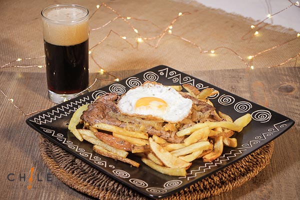 churrascos, con abundante cebolla, un luminoso y perfecto huevo frito por encima de todo con una yema lista para bañar las abundantes papas fritas, para acompañar este plato elegimos una